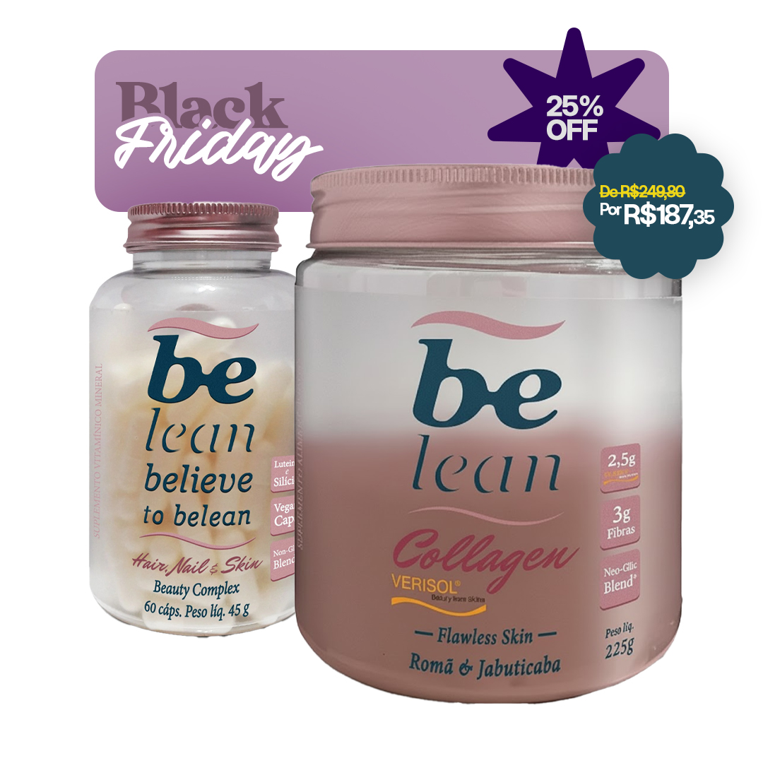 A Black Friday da Belean traz o kit definitivo para sua rotina de beleza! Leve o Collagen Verisol® (Romã e Jabuticaba) junto com o Hair, Nail & Skin (em cápsulas) com um desconto exclusivo de 25%.